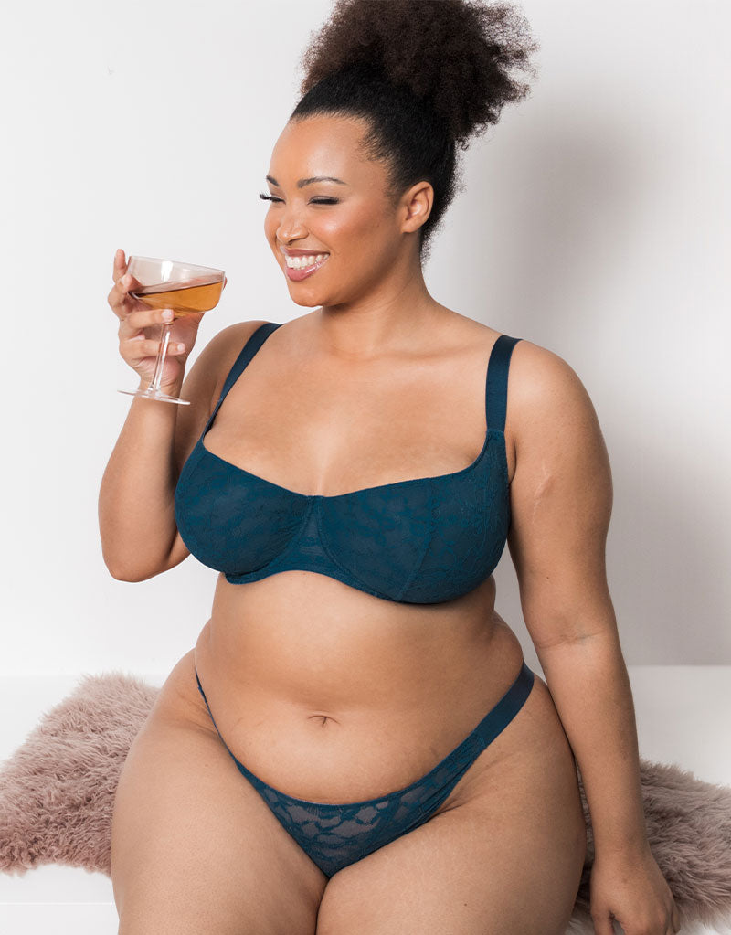 The Curvy Kate All Night Lace scooped balcony bra in Denim Blue is the ultimate fusion of sensuality and support. Crafted from delicate stretch floral lace, this bra offers a luxurious, feminine look that’s designed to be seen. The scooped balcony shape lifts and enhances your bust, while the adjustable and convertible straps ensure a perfect, comfortable fit.