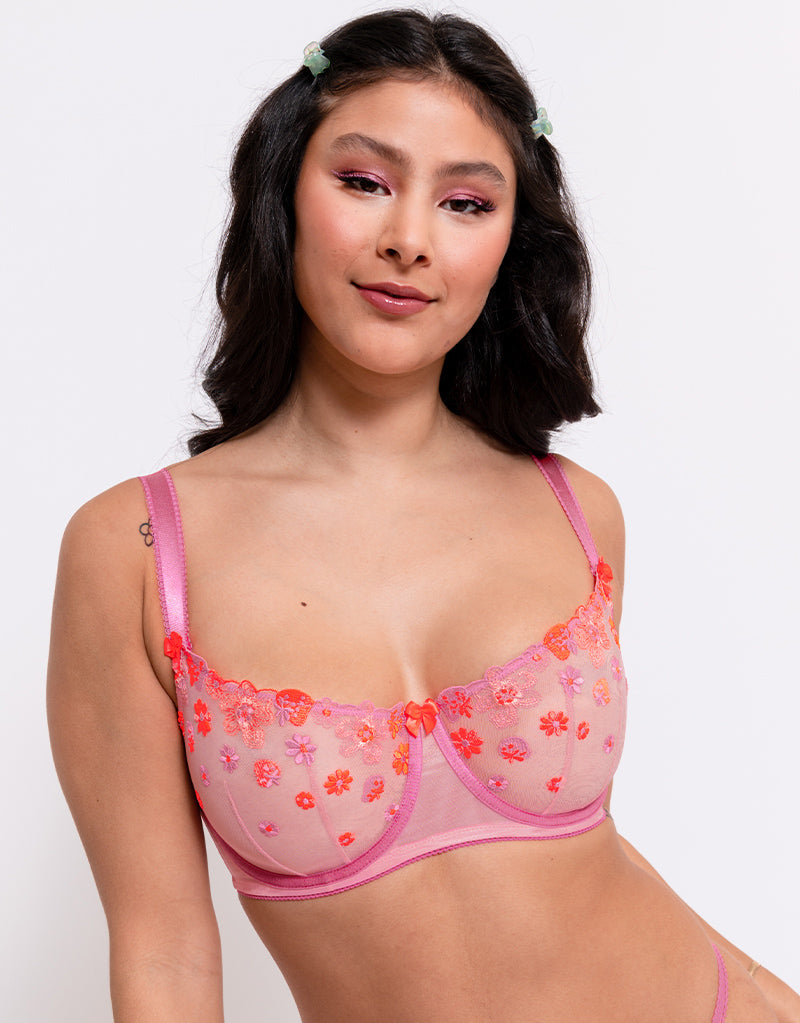 The vertical cup darts create a flattering shape without compromising on support, whilst the rounded cup fit gives your girls incredible uplift and boob boosting cleavage without the need for padding! Strawberry Crush is complete with a gorgeous orange bow to perfectly match the cute floral embroidery detailing, finishing this bra to feminine perfection.