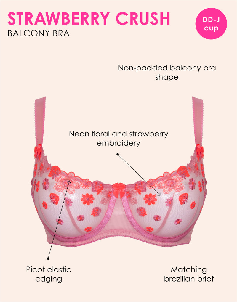 It’s just a Strawberry Crush! Flirty neon embroidery of flowers & strawberries frolic over the cups of this best-selling balcony bra and brief set. The high-shine style lines in our summer pink, alongside picot elastic edging compliments the blush pink base mesh that flatters every skin tone.