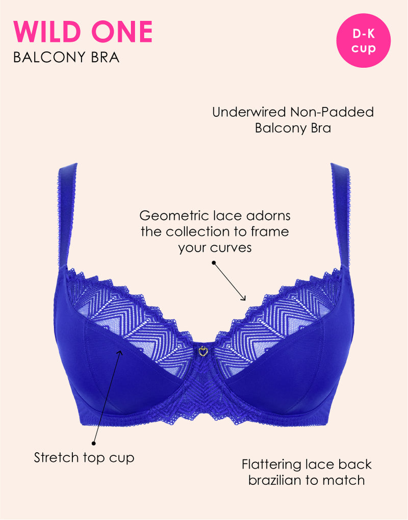 Introducing Wild One Ultraviolet: Our bestselling balcony style returns in a new, electrifying shade. Featuring the same supportive simplex cups and beautiful stretch geometric lace for a flattering silhouette, this vibrant electric blue bra offers exceptional lift and comfort, making it perfect for both day and night wear.