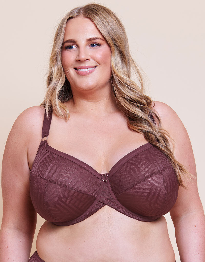 Our gorgeous WonderFull Vibe bra is now available in a rich auburn brown, in abstract geometric lace which lies exceptionally flat for a smooth look and feel under clothes.